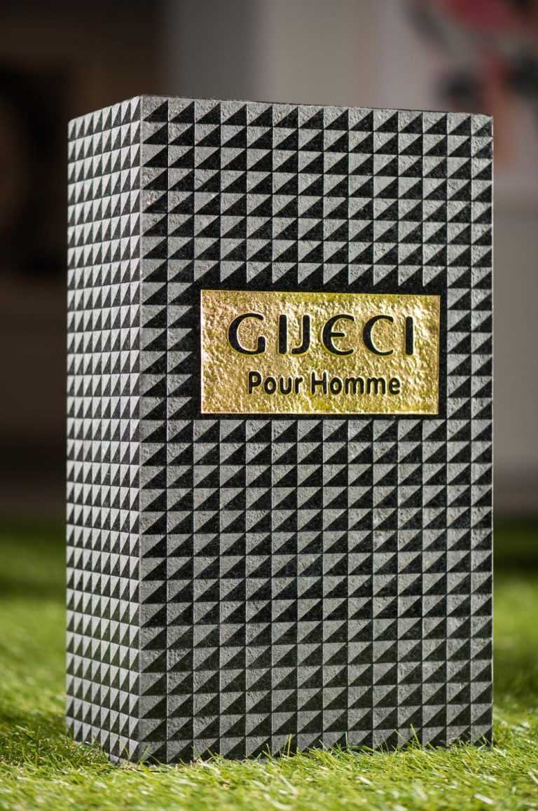 Abrasive blasting, gold leaf on black granite