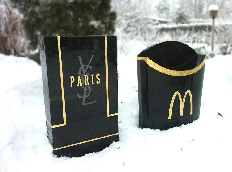 Installation view Death of YSL, 2011 Abrasive blasting, gold leaf on black granite 35 x 60 x 15 cm Death of McDonald´s, 2011 Abrasive blasting, gold leaf on black granite 49 x 57 x 15 cm